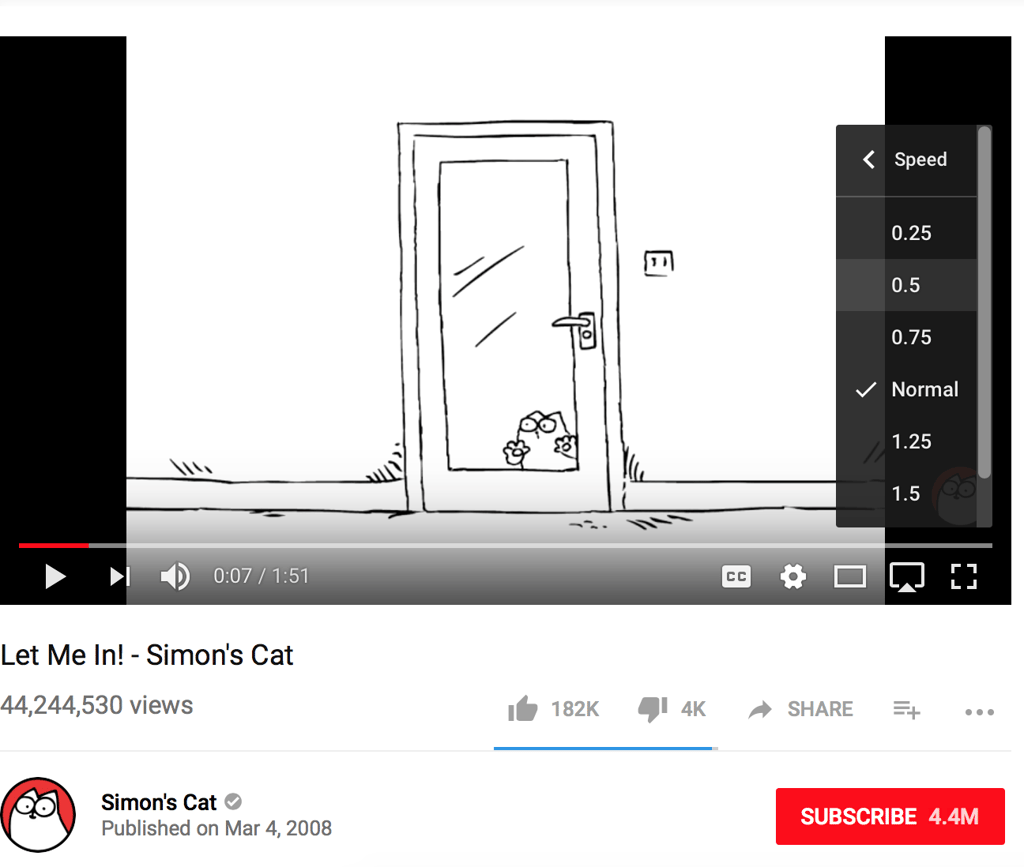 First, click on the "Settings" icon (a little wheel next to the CC icon) and click on "speed" on the pop-up menu. Then, select a slower speed.